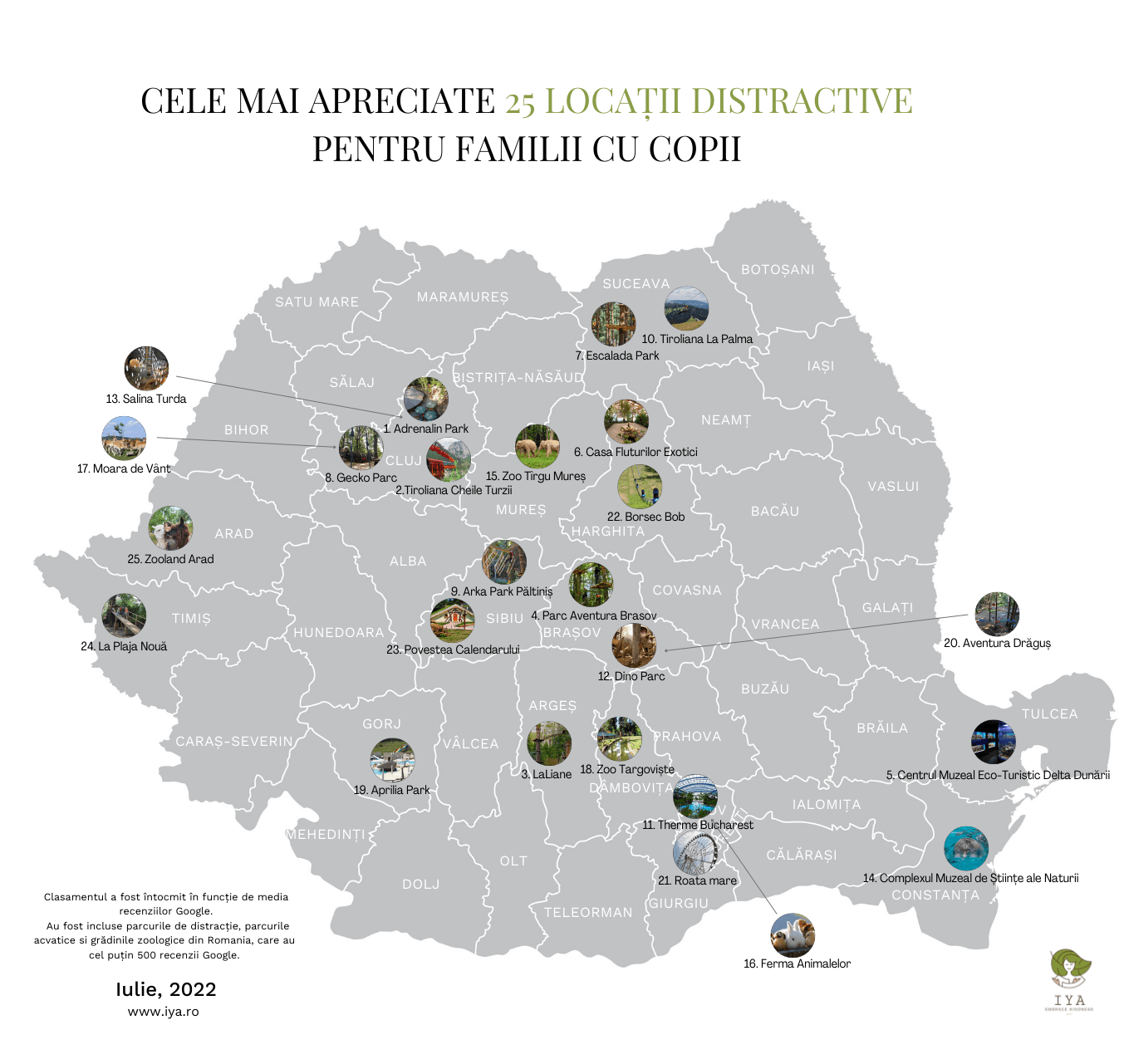 Dacă ești părinte și pentru tine vara înseamnă doar un concediu de două săptămâni și, în rest, luni întregi în care trebuie să găsești surse de distracție pentru copii, din care, eventual, să nu pleci mai stresat decât erai deja, am pregătit pentru tine un material despre cele mai apreciate 25 de atracții din România pentru familii, conform recenziilor de pe Google Maps. Am considerat doar locații care propun activități potrivite copiilor (aventură și activități sportive, explorare, apă/piscine, activități cu animale) și care au primit mai mult de 500 de recenzii de la utilizatori. Pregătește, așadar, rucsacul cu cele necesare și să pornim la drum!
